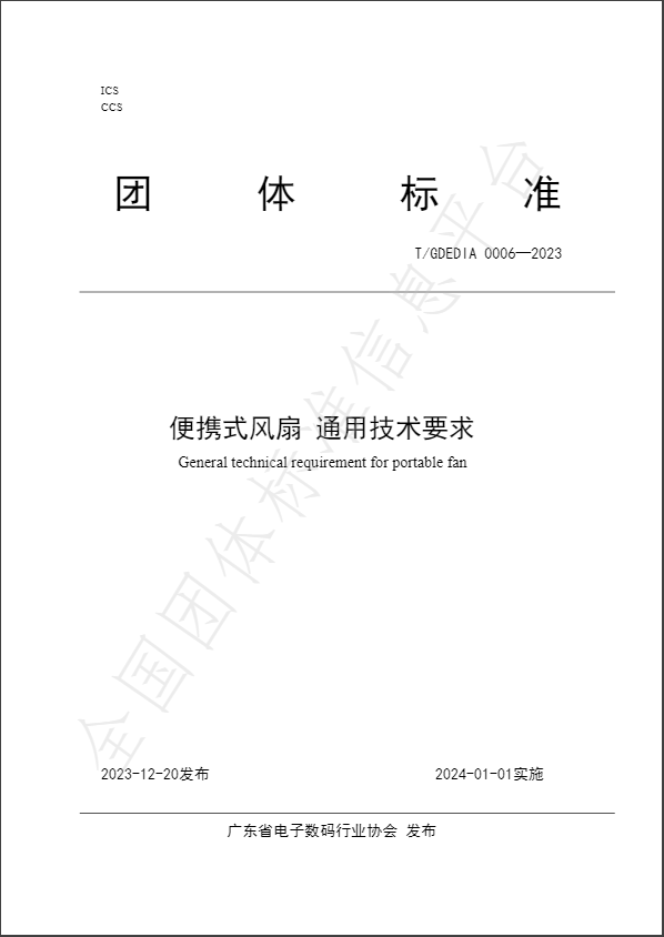 2023年12月20日,T/GDEDIA 0006—2023《便携式风扇 通用技术要求》发布并于2024年01月01日正式实施。